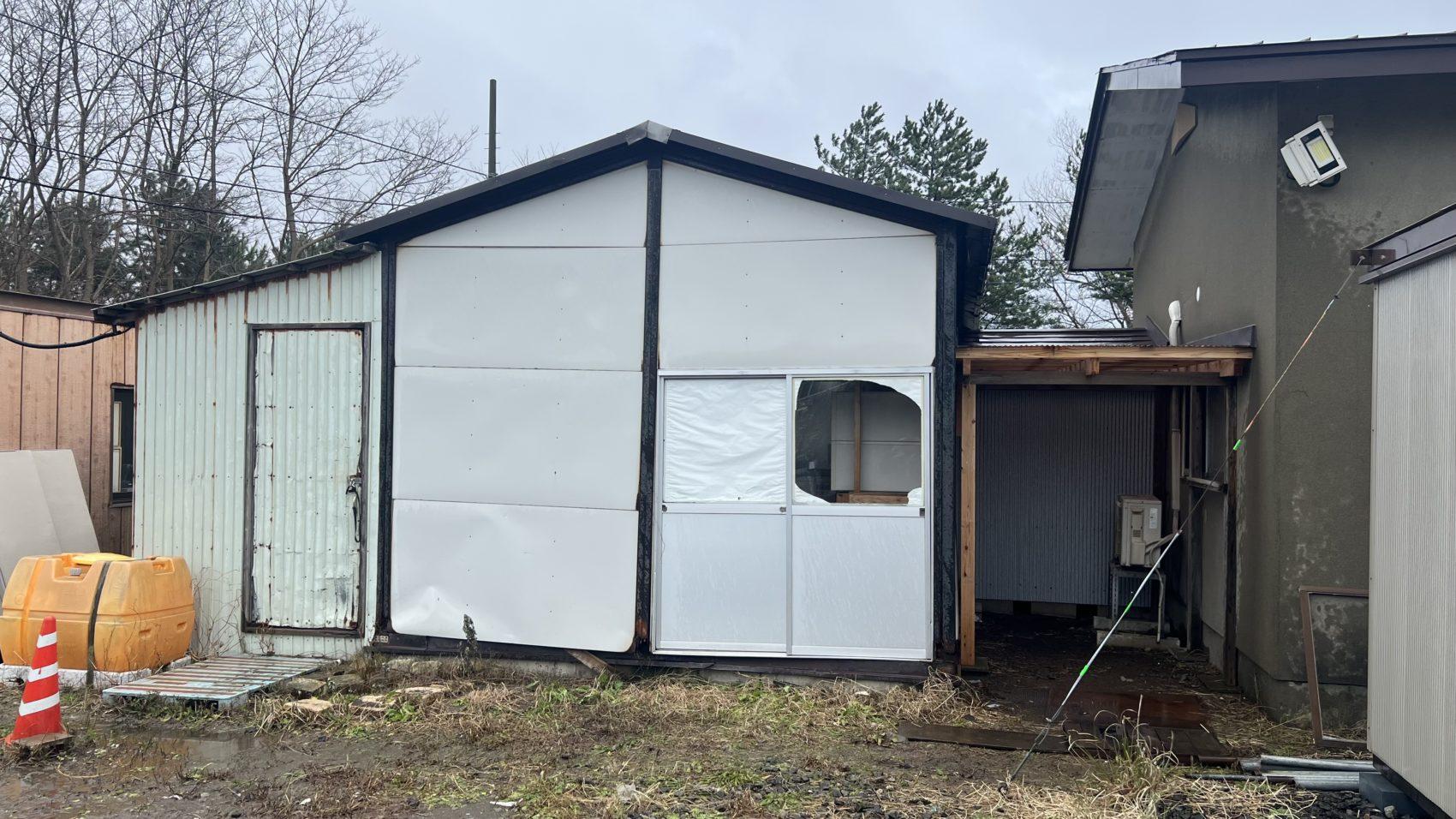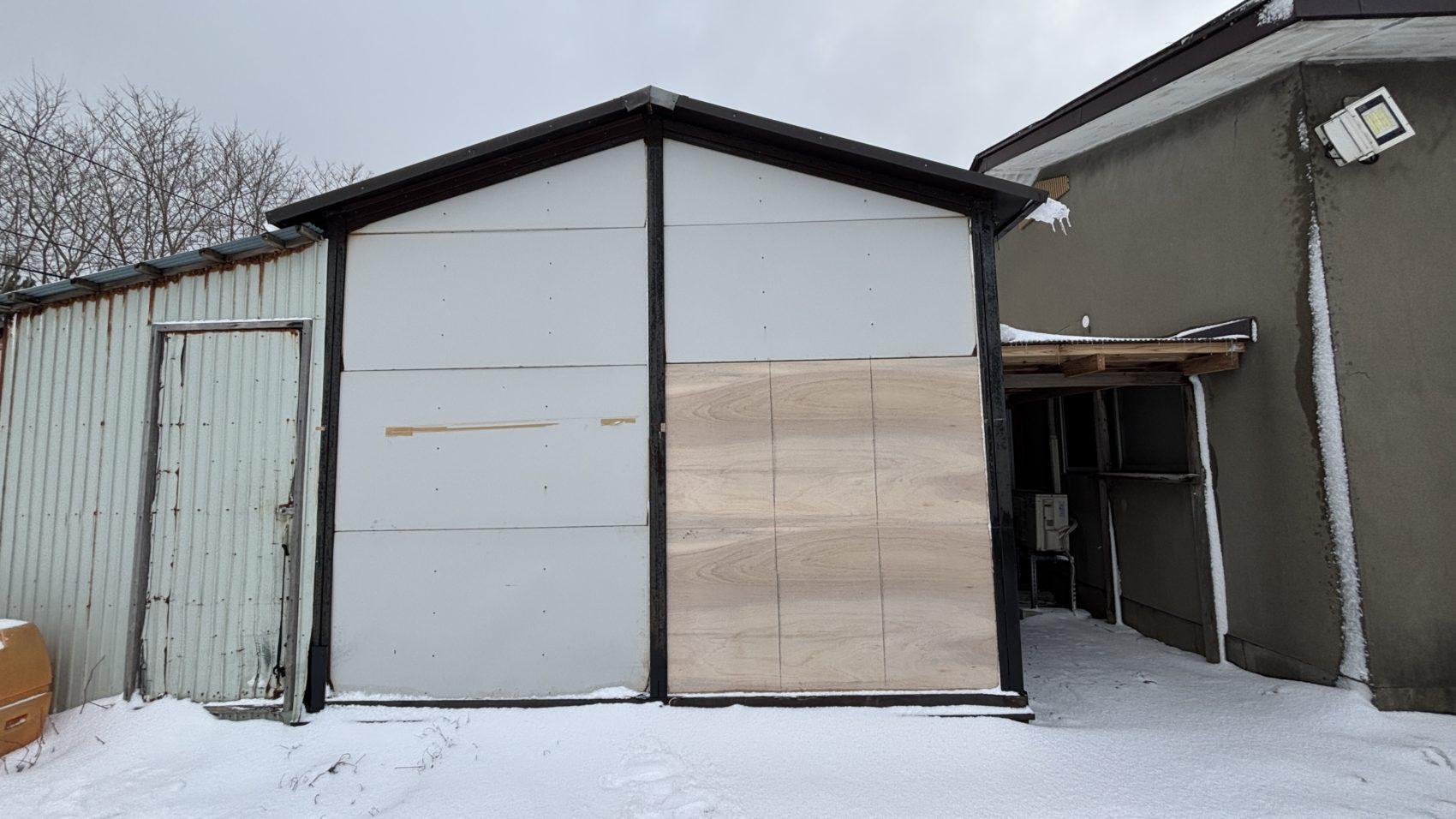 倉庫の壁が強風により剝がれてしまったということで修繕を行いました。 柱下部を溶接、引戸を撤去しました。下地を入れ開口部を塞ぎました。 雨や湿気による腐食防止のため防水シートを貼りました。 それから塗装し、元々の開口部は板金を被せました。 柱も板金を被せています。 完成